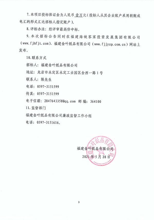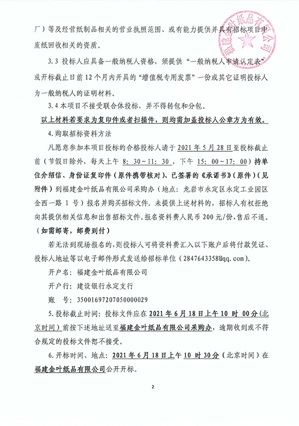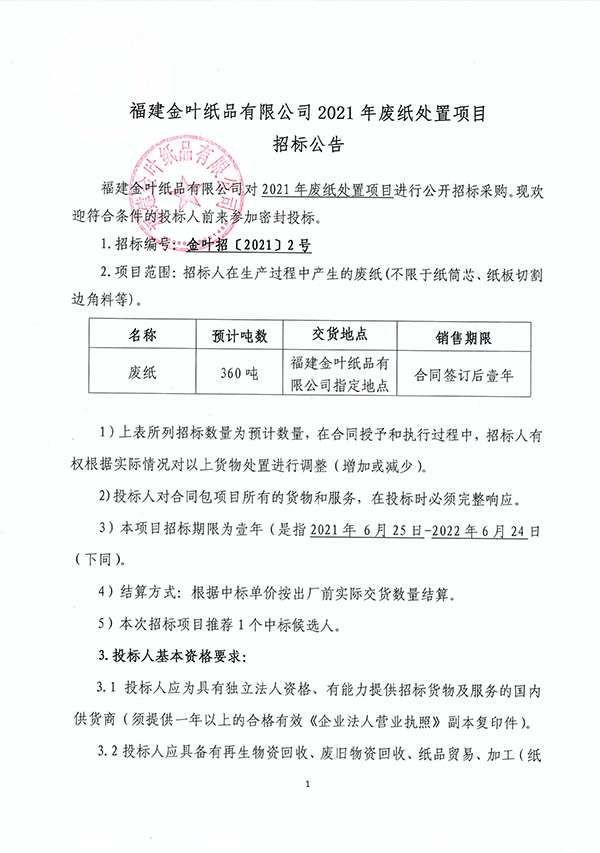 福建金葉紙品有限公司2021年廢紙?zhí)幹庙?xiàng)目招標(biāo)公告