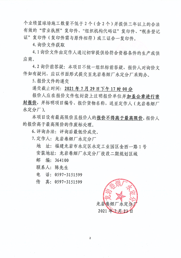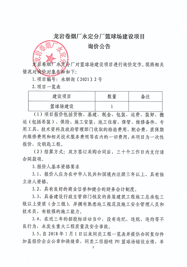 龍巖卷煙廠永定分廠籃球場建設(shè)項(xiàng)目詢價(jià)公告