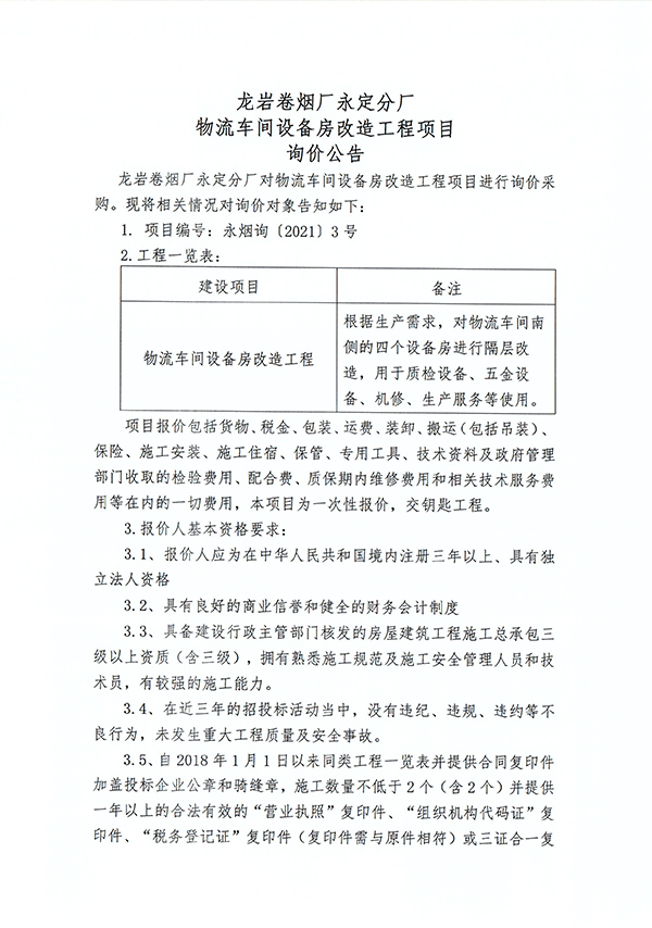 龍巖卷煙廠永定分廠物流車間設(shè)備房改造工程項(xiàng)目詢價(jià)公告