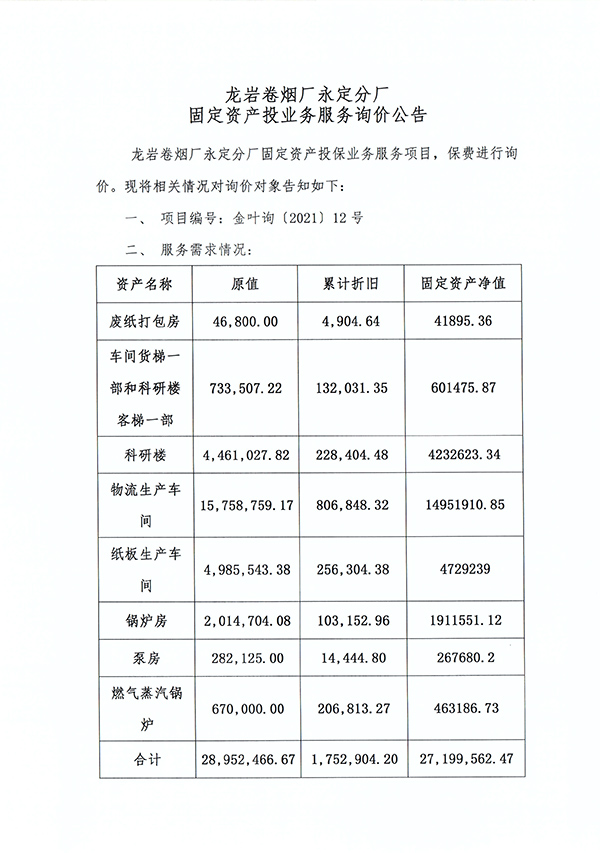 龍巖卷煙廠永定分廠固定資產(chǎn)投保業(yè)務(wù)服務(wù)項(xiàng)目詢價(jià)公告
