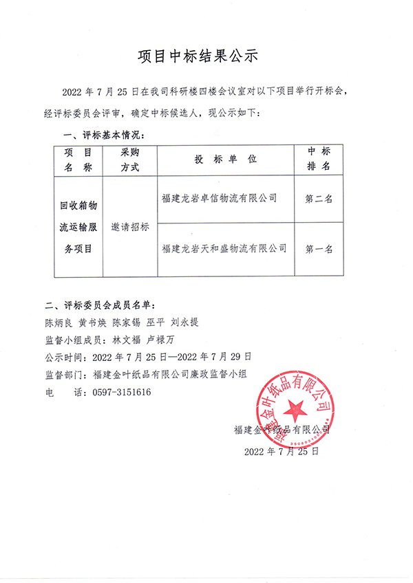 回收箱物流運輸服務(wù)項目中標(biāo)結(jié)果公示