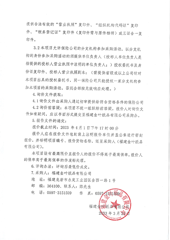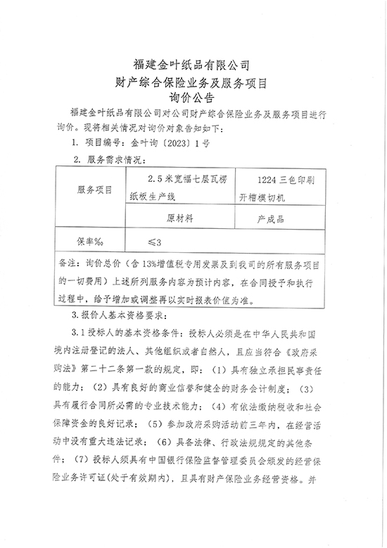 福建金葉紙品有限公司財(cái)產(chǎn)綜合保險業(yè)務(wù)及服務(wù)項(xiàng)目詢價公告