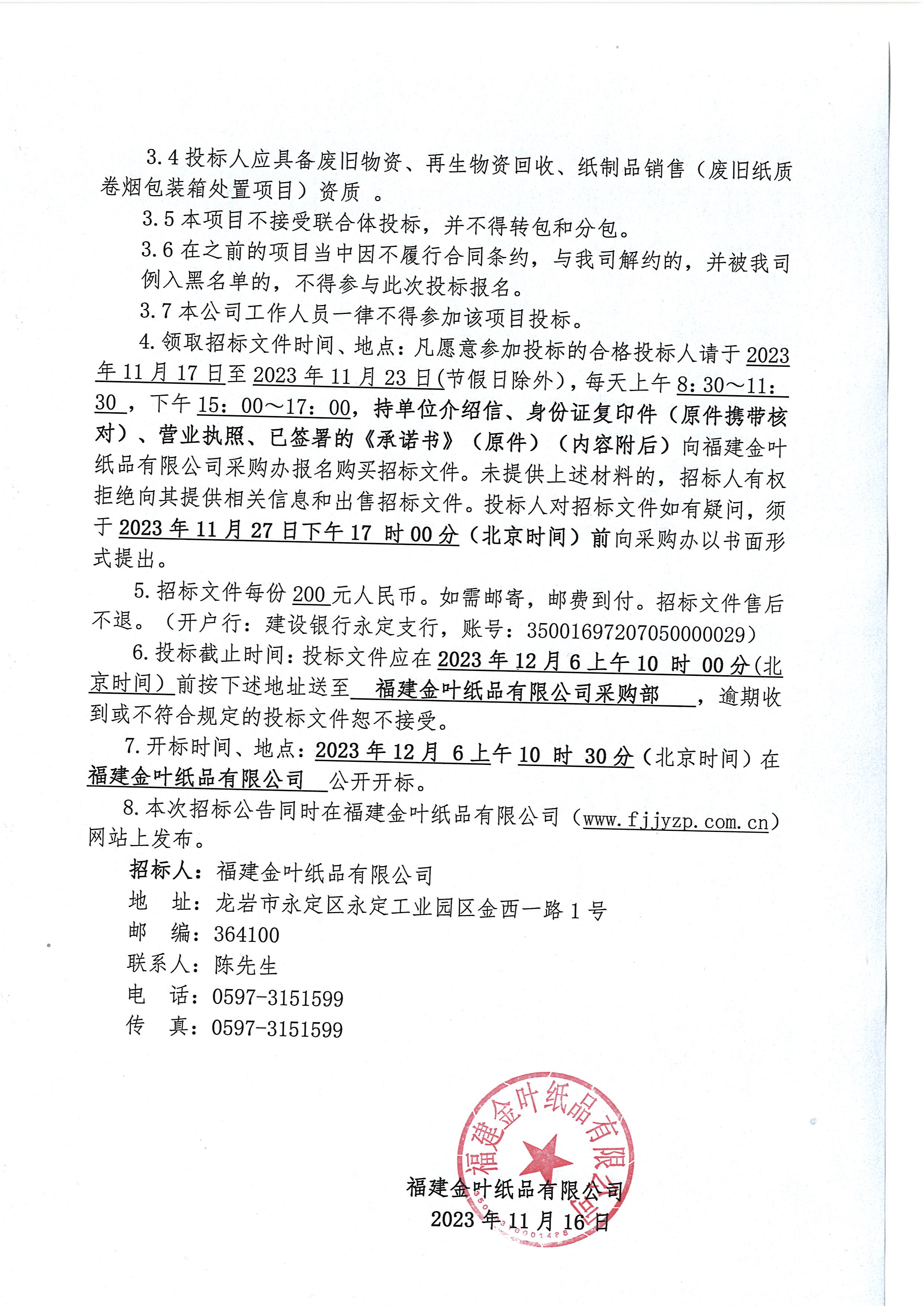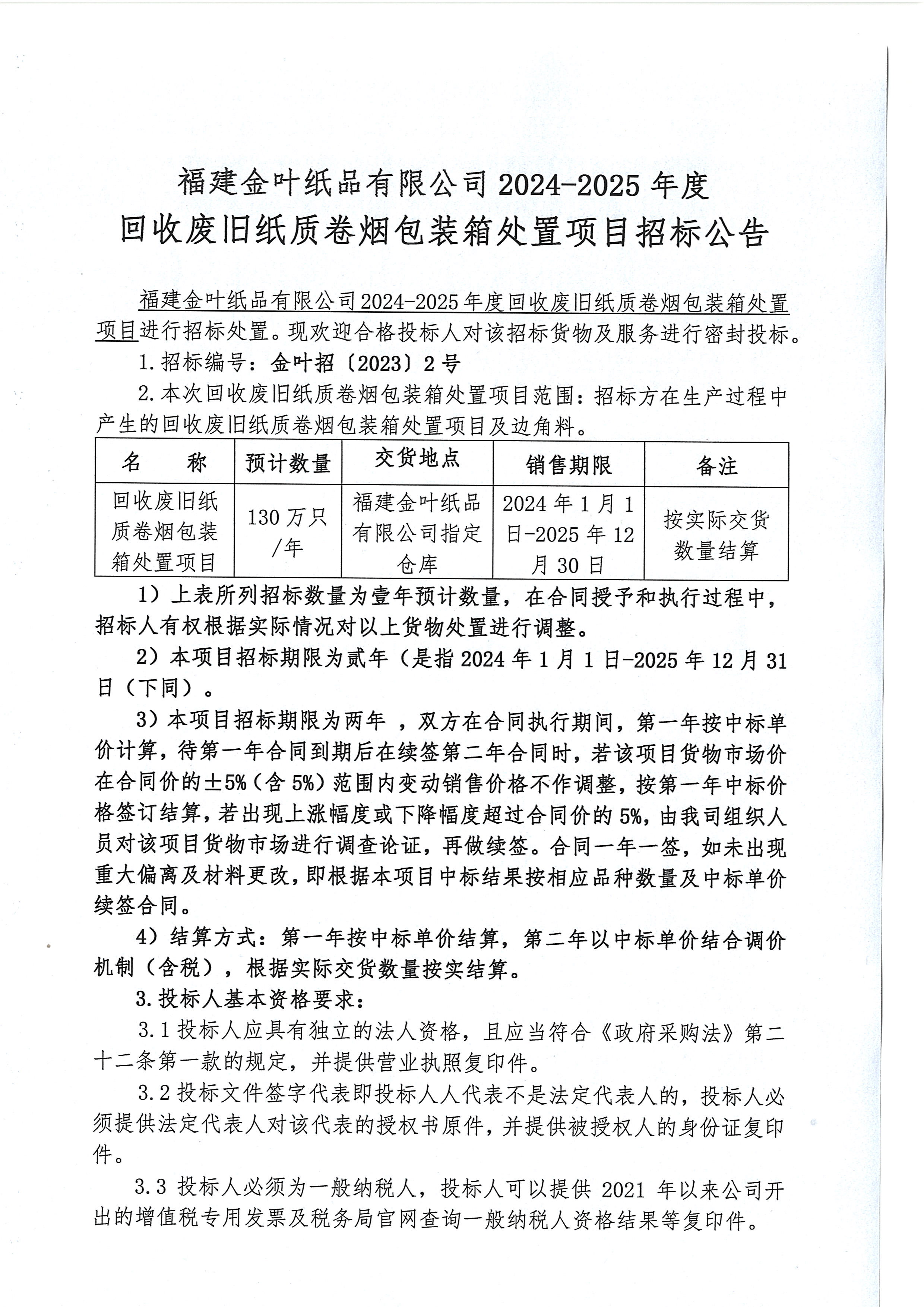 福建金葉紙品有限公司招標公告
