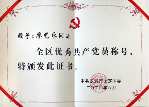 喜訊!龍巖卷煙廠永定分廠黨員廖藝永同志榮獲“全區(qū)優(yōu)秀共產(chǎn)黨員”稱號(hào)